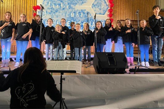 Wie bereits angekündigt kam es früher als gedacht zum ersten Auftritt der MeOLas unter neuer Leitung. So durften die Kinder und Jugendlichen mit Carolin Antoni nun bereits zum Jahreskonzert des Männergesangvereins Landshausen im Rampenlicht stehen. Nach einem Start mit den Liedern „Du hast’n Freund in mir“ und „Wir sind alle Kinder dieser Welt“ ging es vereint mit dem Männergesangsverein weiter mit der hoffnungsvollen Botschaft „Kinder der Zukunft“. Für alle Beiträge gab es viel Applaus von den großen Akteuren sowie vom Publikum in den voll besetzten Reihen. Und auch beim großen Finale mit „Ein Stern, der deinen Namen trägt“ durfte MeOLa ganz vorne mit dabei sein. Passend zum Lied verteilten die jungen Sängerinnen und Sänger anschließend an alle Anwesenden Goldsterne, mit der Aufforderung, den Namen eines geliebten Menschen darauf zu schreiben und es ihm oder ihr zu überreichen. Eine Aufgabe, die die MeOLas mit großem Stolz erledigten und selbst die Jüngsten so in den Bann zog, dass sie bis zum Ende der Gesangsbeiträge durchhielten!